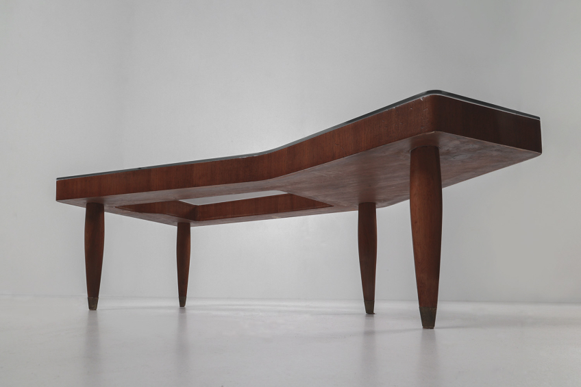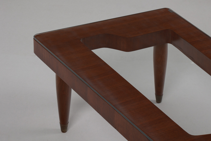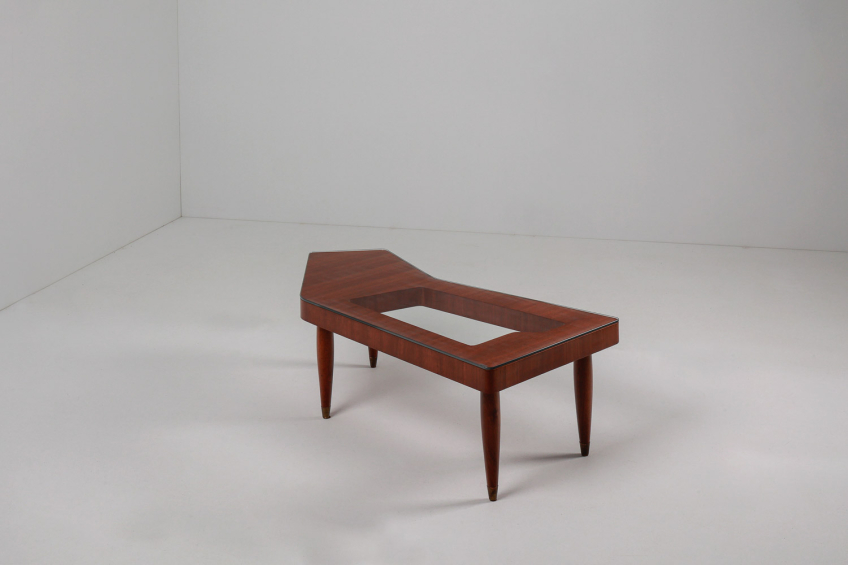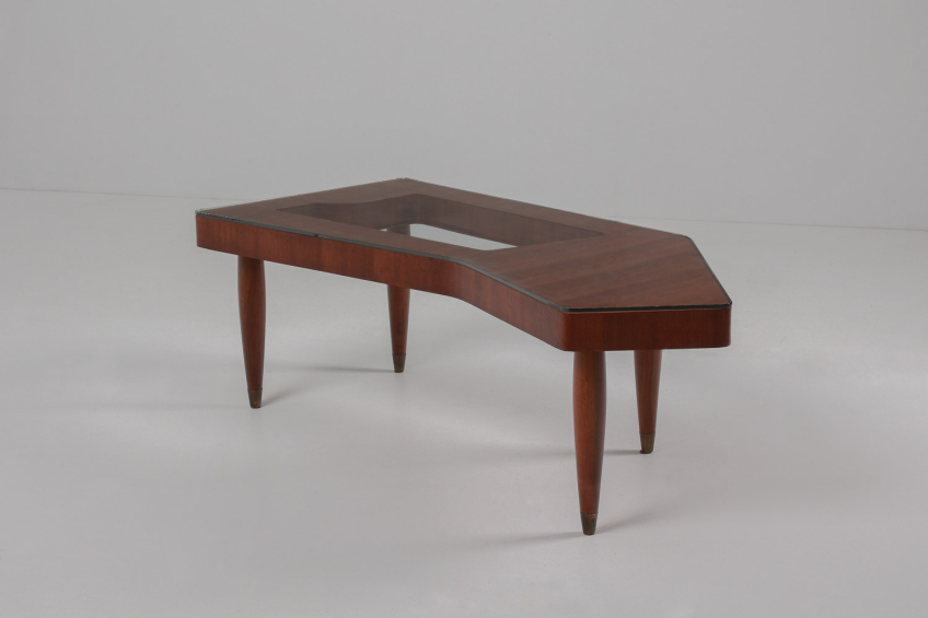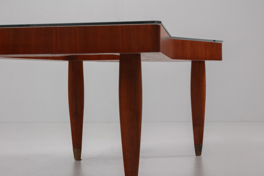 Cherry wood structure with brass details and glass top.