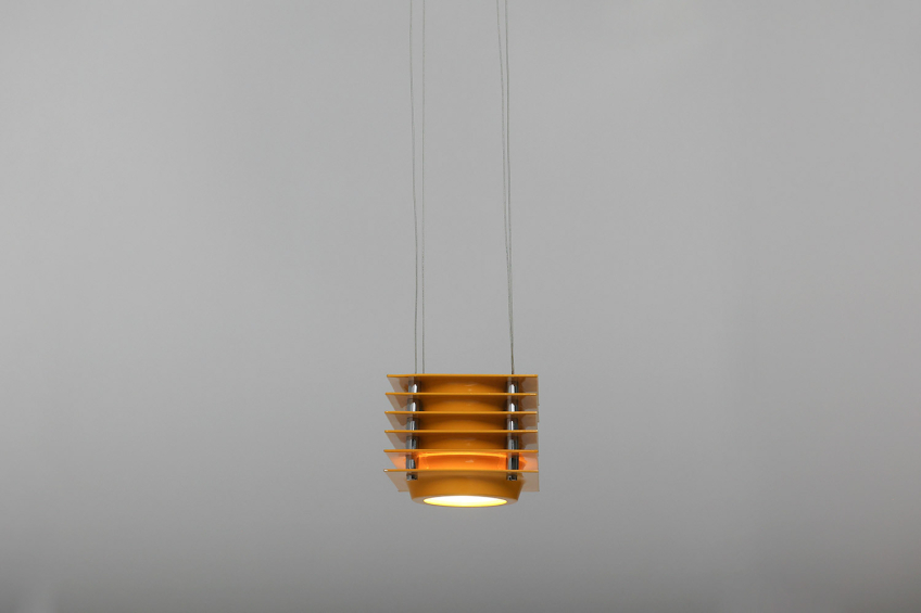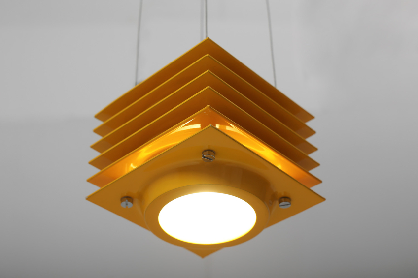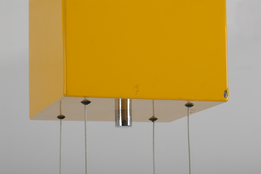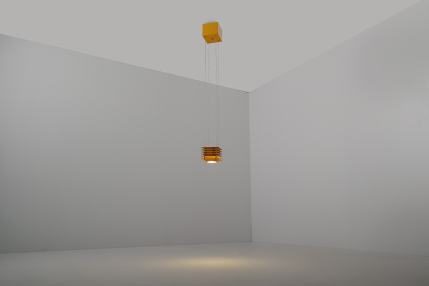 Bold square diffuser made of layered, yellow-painted enamelled aluminum planes with chromed metal details.