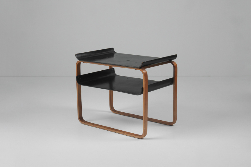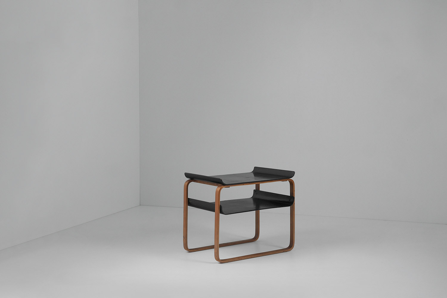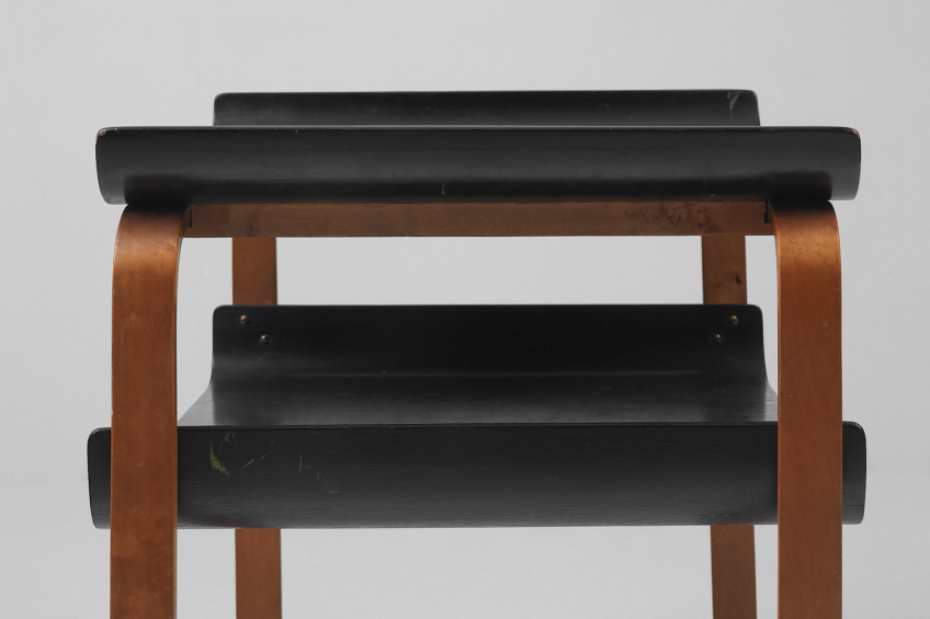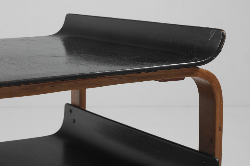 SPECIAL NOTE Originally created for the Paimio Sanatorium in Finland in the 1931, the table reflects Aalto's commitment to human-centered design and his pioneering work with bentwood techniques. The upturned edges of the shelves not only contribute to the table's distinctive aesthetic but also serve a practical purpose by keeping items securely in place. This design showcases Aalto's signature fluid curves and his mastery in manipulating wood to achieve both strength and visual lightness.